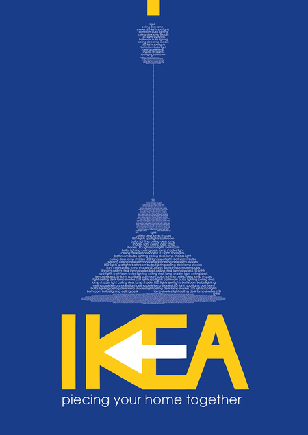 Дизайнер Мэтью Барбер предложил идею ребрендинга Икеи и в своих рекламных плакатах предлагает собрать свой дом по кусочкам, как собраны предметы мебели из слов и предложений. При этом не так важно, что там написано, сами слова с упоминаниями различной мебели собираются воедино.