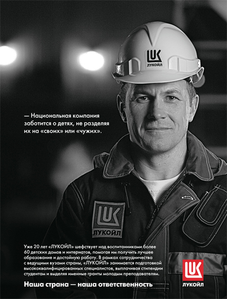 Вот рекламные плакаты ЛУКОЙЛа выполнены в формате цитат из интервью работников компании, главной мыслью выставляя социальную составляющую бренда. Компания в первую очередь про людей и социальную ответственность. Формат цитат вызывает у зрителя доверие. Этот пример более серьезный, но от этого не менее убедительный.