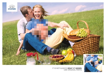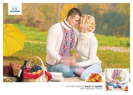 Фирма Hyundai доносит до покупателей мысль, что важны оригинальные запчасти автомобиля. Это передано через метафору недостающего пазла и заблюренного куска картинки с весьма провокационным подтекстом.