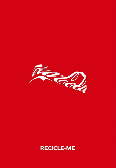 Кока кола предлагает прием негативного пространства, но здесь также присутствует игра формы из текста. Бутылка газировки имеет настолько узнаваемую форму, что бренду достаточно поставить текст в правильных пропорциях, чуть закруглить и зритель уже видит бутылку там, где ее нет. А дальше предложено еще более интересное решение, призывающее к переработке. Надпись трансформируется и сжимается, как кривая бутылка, которую нужно отнести на переработку.