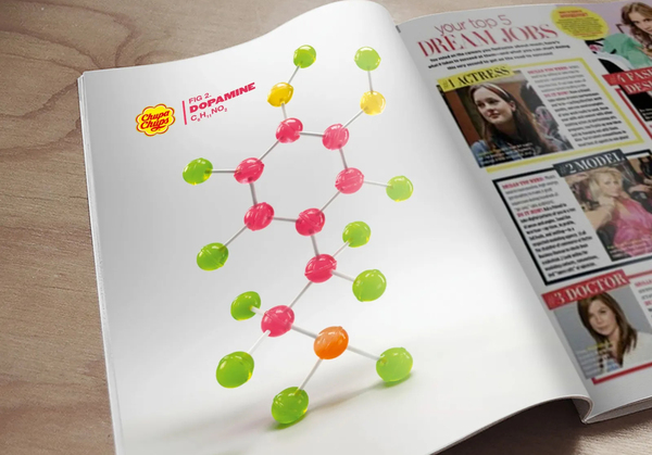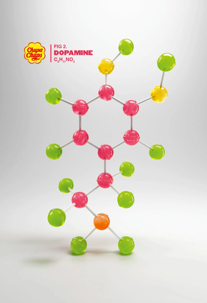 Чупа Чупс выстраивает из своего продукта молекулу. Сами конфеты становятся по цветам, где каждый вкус олицетворяет свой атом. Так бренд доносит идею о том, что их продукт — увеличивает количество «гормонов счастья» (дофамина, серотонина и эндорфина) и сам по себе является сладким удовольствием.
