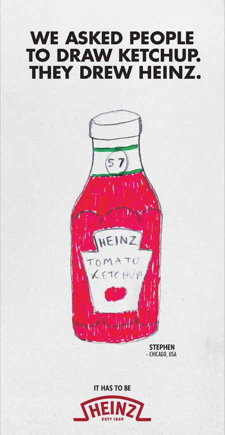 Хаинз тоже умело использует свою узнаваемость, как самого популярного бренда кетчупа. «Мы попросили людей нарисовать кетчуп. Они нарисовали Хаинз», коротко и просто бренд использует силу знака — их бутылочки для кетчупа. Тем самым компания доносит идею о том, что когда люди думают о кетчупе, они думают об их бренде.