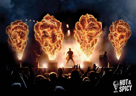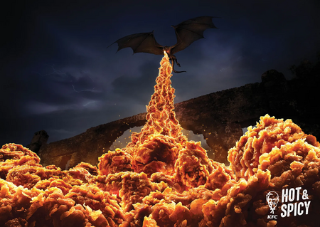 Бренд КФС сопоставляет свои горячие и острые куриные крылышки с огнем, выглядит это очень эффектно и сразу говорит о свойствах продукта. Не просто острота, она почти кинематографична.