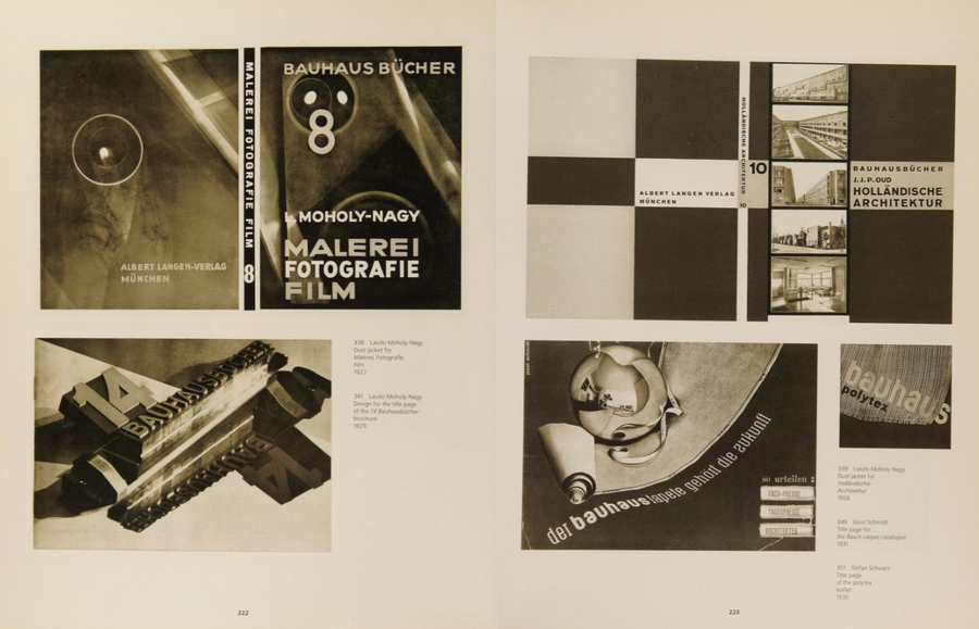 Фотокниги Баухауса стали образцом фотоальбомов эпохы Веймара. С 1925 по 1930 год Вальтер Гропиус и Ласло Мохоли-Надж совместно руководили изданием 14 книг из серии «Фотокнига Баухауза». Среди них наиболее значимая — «Малерия, фотография, кино». Дизайн обложки, вдохновленный дадаизмом, экспрессионизмом, конструктивизмом и движением Баухауса, носит ярко выраженный модернистский характер. Дизайнеры использовали самые передовые визуальные приемы того времени: крупные беззубые шрифты, фотомонтаж, смелое использование цветов и выразительные градиенты — эти элементы до сих пор выглядят свежо и прогрессивно на полках книжных магазинов.