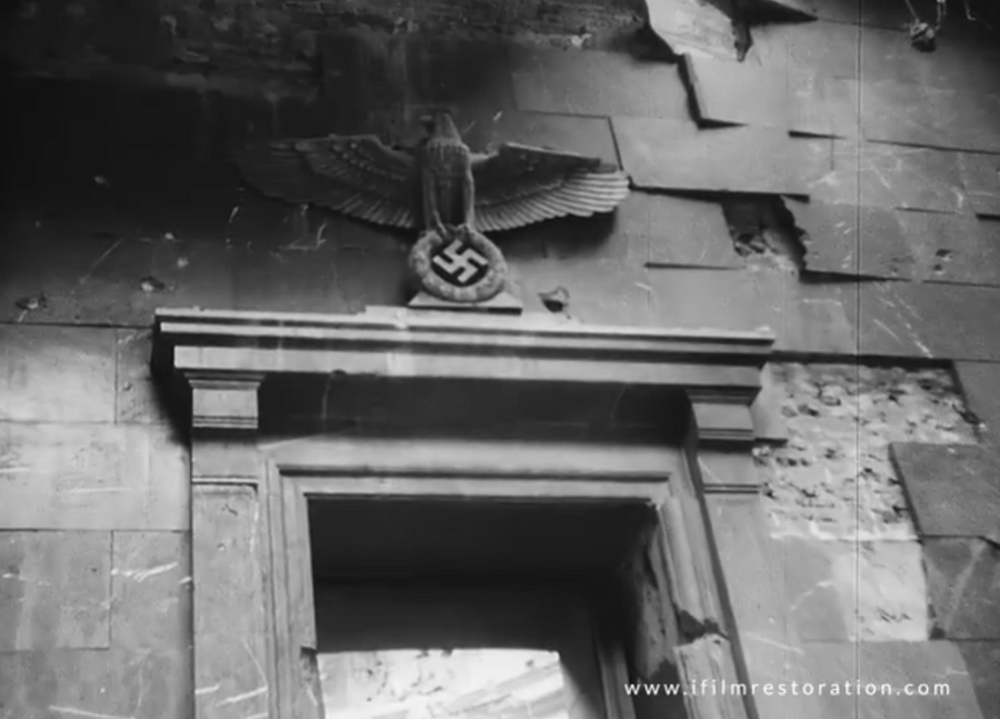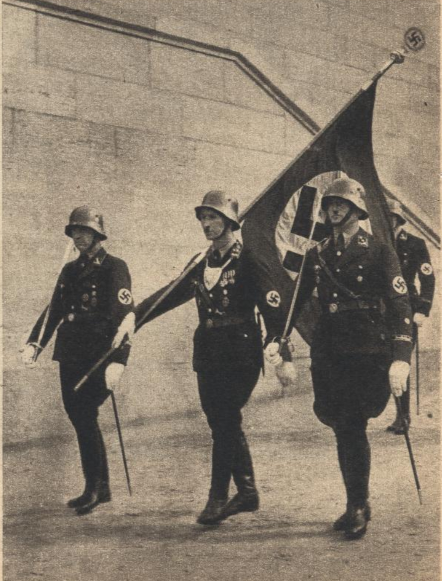 Потом, символичность цвета. Национал-социалистическая партия была известна широким использованием символических знаков — многочисленные плакаты, нацистские орлы, строящегося солдаты выглядели особенно выразительно на фотографиях. Нацистские флаги покрывали каждую улицу городов, словно волна, создавая пугающий и впечатляющий визуальный эффект.