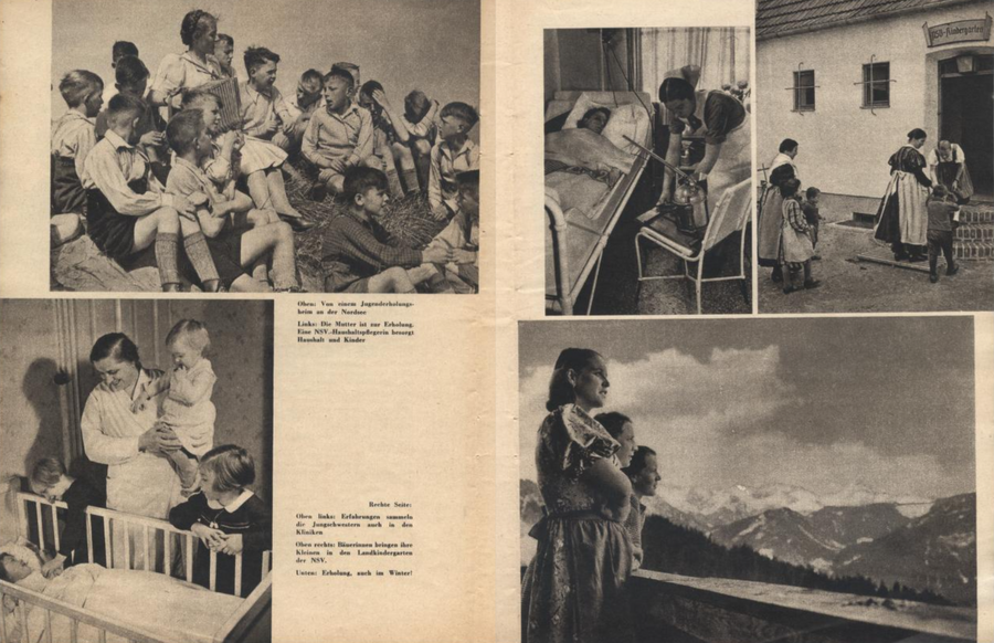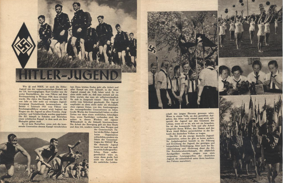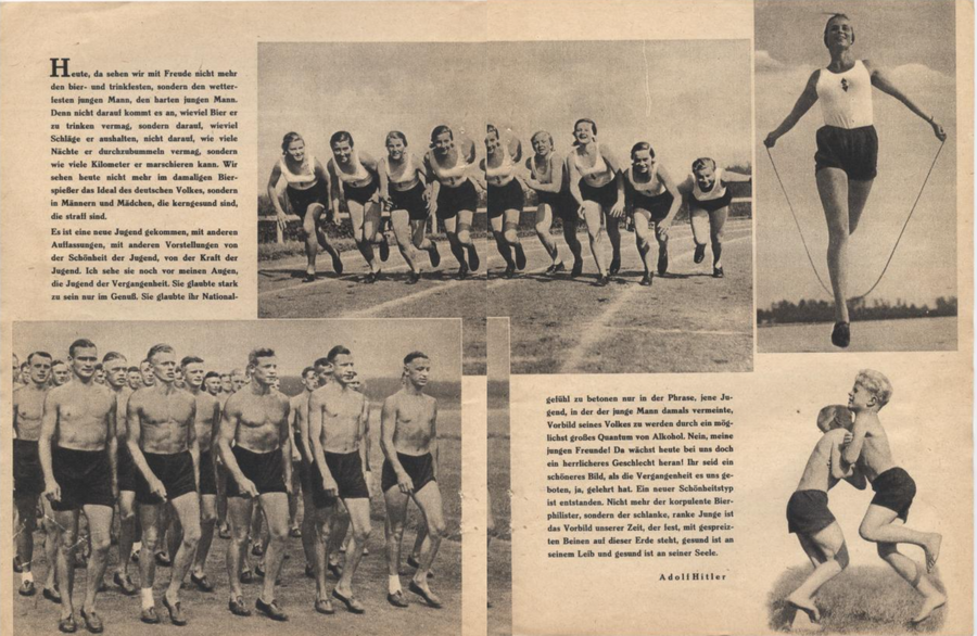 Во-вторых, пропаганда превосходства «арийской расы». Многие фотоальбомы посвящены демонстрации так называемого «чистокровного арийца» в идеальном образе, подчеркивая здоровые, сильные и красивые физиологические черты. Эти изображения тесно связаны с расистской идеологией нацистов, став визуальным инструментом расовой пропаганды.