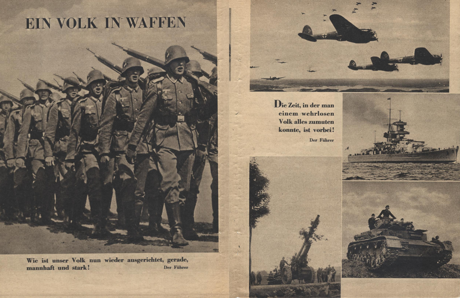 Кроме того, официальные нацистские фотоальбомы активно демонстрировали военные сюжеты — по сути, они служили пропагандистским целям: мобилизации населения под властью, легитимации идеологии и оправданию войны, являясь визуальным инструментом общественного мнения при тоталитарном правлении. Изображения солдат, оружия и коллективных действий на военных сценах могли пробудить патриотическое чувство гордости за народ и чувство принадлежности к коллективу. Показывая дисциплину армии и передовость вооружений, фотоальбомы передавали сигнал о «народной силе», разжигали патриотический энтузиазм людей и побуждали их добровольно поддерживать войну и участвовать в военной работе.