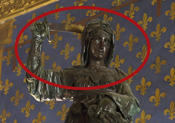 Бронзовая скульптура изображает момент свершения подвига. Юдифь занесла меч для удара, ее поза динамична и решительна. Это монумент гражданской доблести, спасительнице города. Здесь сила героини подана в ее героическом, почти монументальном аспекте. Диалектика заключается в контрасте ее хрупкости и мощи Олоферна, которого она побеждает.