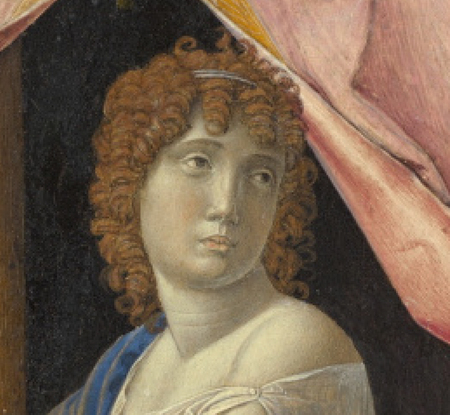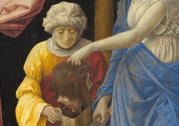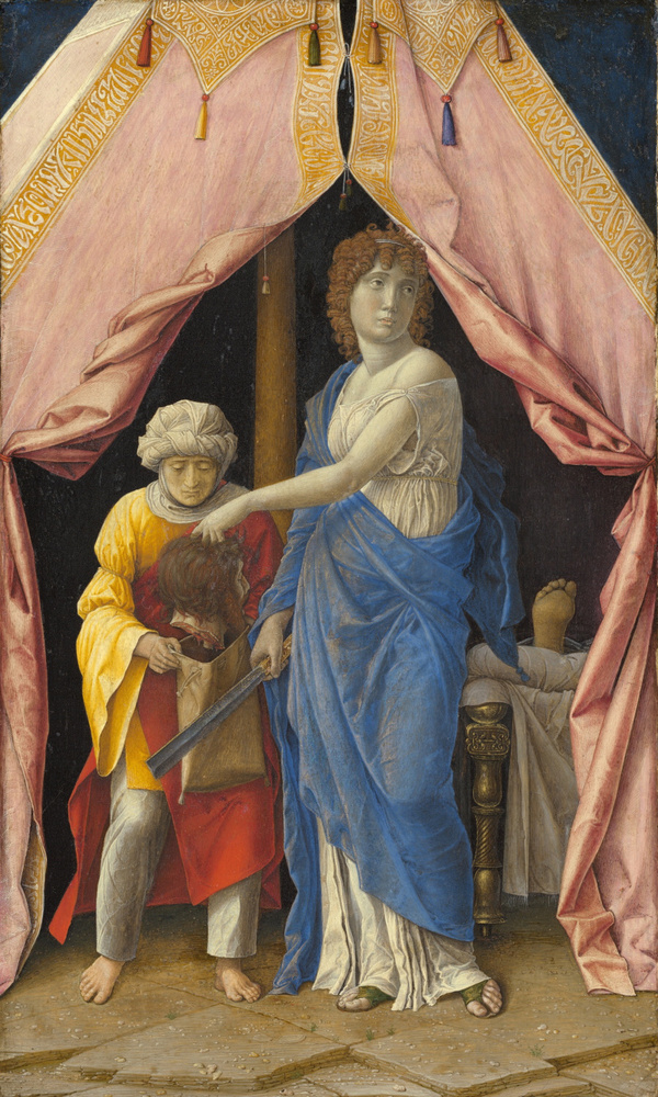 Андреа Мантенья, «Юдифь и Олоферн»: Мантенья изображает момент сразу после казни. Юдифь стоит в спокойной, величественной позе, ее лицо выражает холодную решимость. Она помещает голову Олоферна в сумку, которую держит ее служанка.
