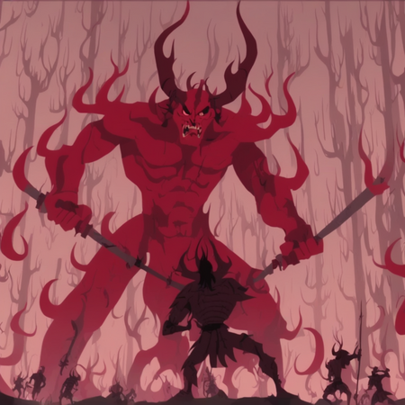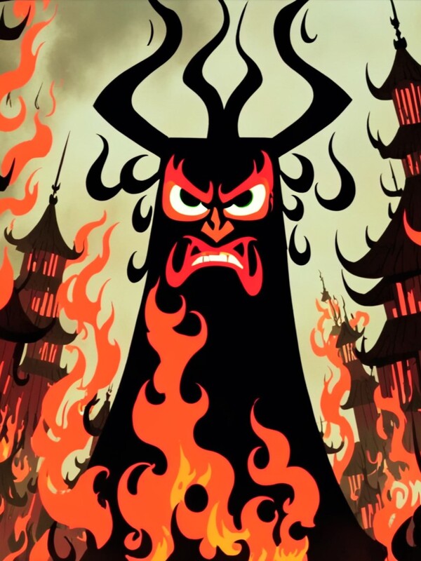 Наглядное сравнение первой генерации изображения и генерации с измененными параметрами на примере Aku, персонажа из мультсериала