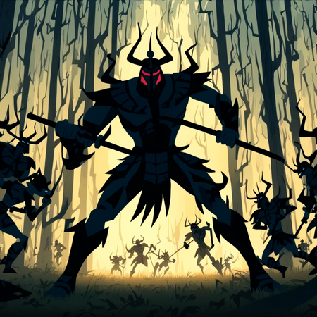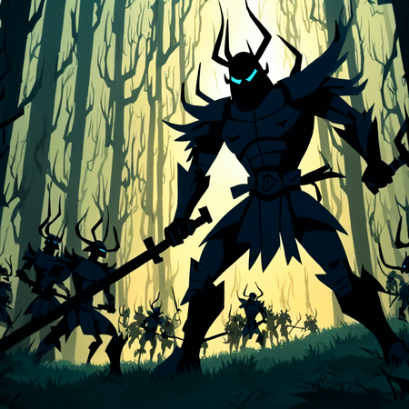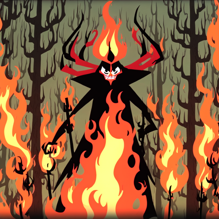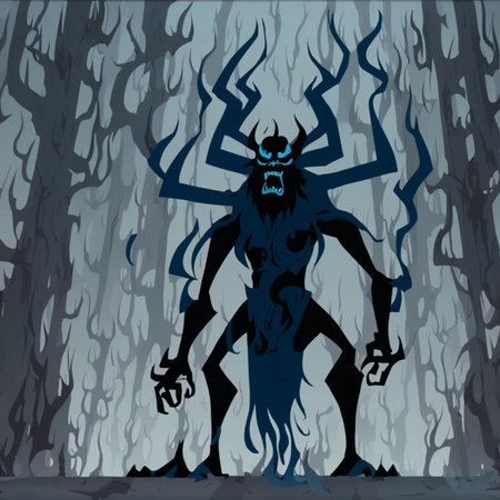 Уже на первых итерациях видно, что нейросеть успешно усвоила ключевые особенности художественного стиля мультсериала. Алгоритм начал воспроизводить характерные острые и угловатые формы — особенно это заметно по таким элементам, как причудливо изогнутые стволы деревьев и изломанные очертания рогов демонических персонажей.