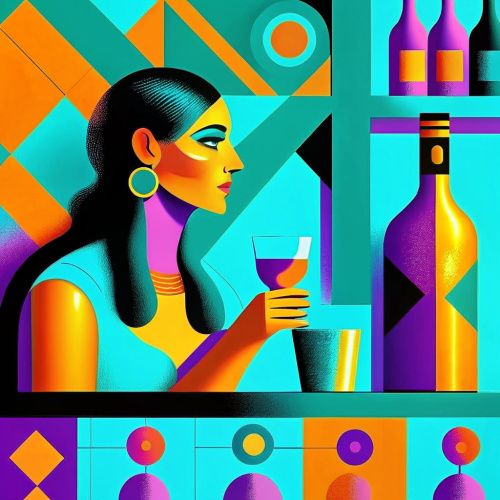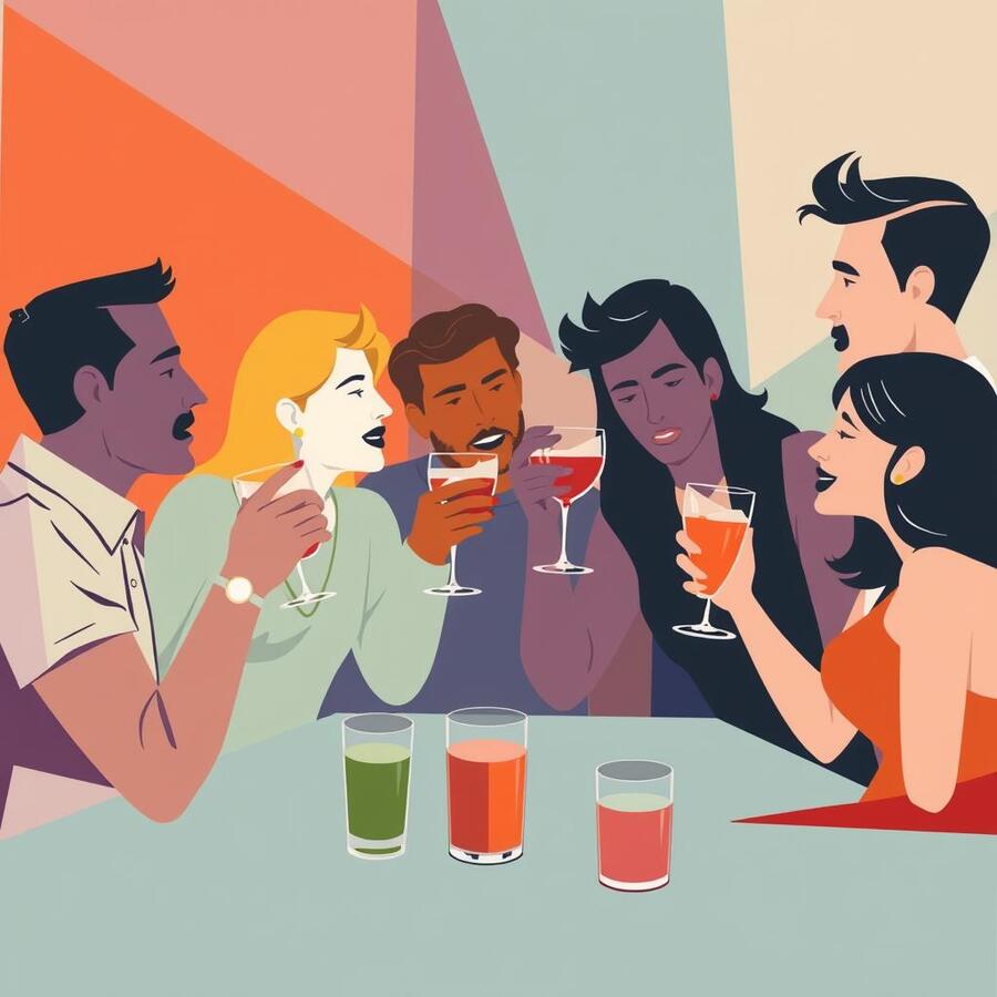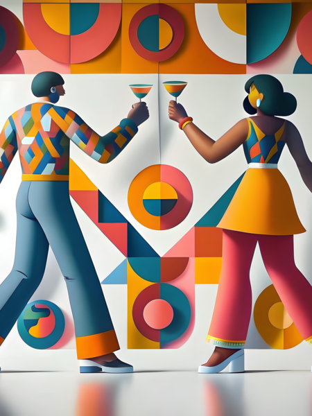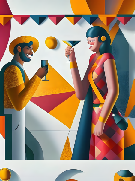 Постеры сгенерированы в Recraft, качество улучшено в Upscayl. Промпты: vibrant abstract cubist-inspired poster of several people drinking and having fun at a party, vibrant stylized cubist-inspired poster of two people dancing at a party with drinks in hand, colorful advertisement for an alcohol brand named Mingle featuring bottles with unusual abstract shapes.