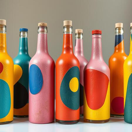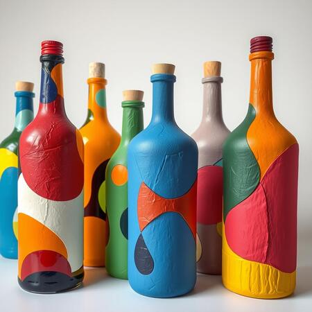 Продукция сгенерирована сетью Gamma. Промпт: several colorful bottles of alcohol with unusual abstract shapes that look like they were hand-made from papier mache or clay.