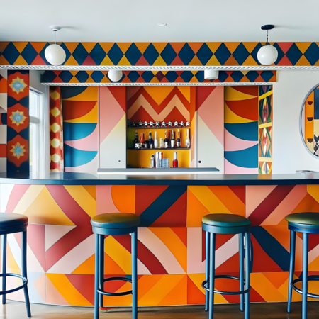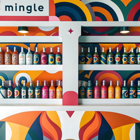 Изображения брендовых магазинов также сгенерированы в Recraft. Промпты: the interior of a shop for an alcohol brand named Mingle with a colorful design and patterns on the walls. on the shelves there are bottles with unusual abstract shapes, the interior of a bar with a colorful maximalist design and patterns on the walls.