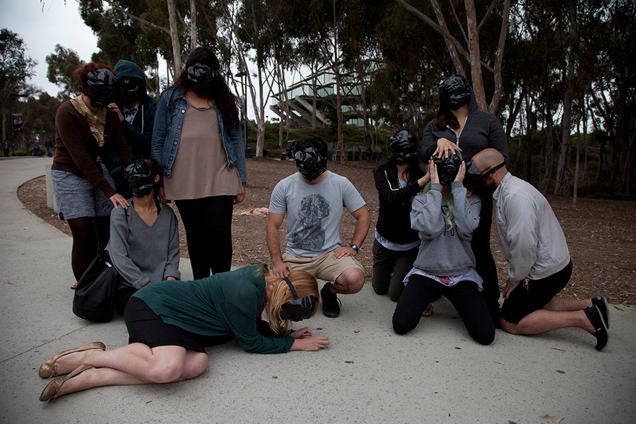 (left-right) Zach Blas / Elle Mehrmand / micha cárdenas / Paul Mpagi Sepuya, installation and performance of Face Cages, 2015.