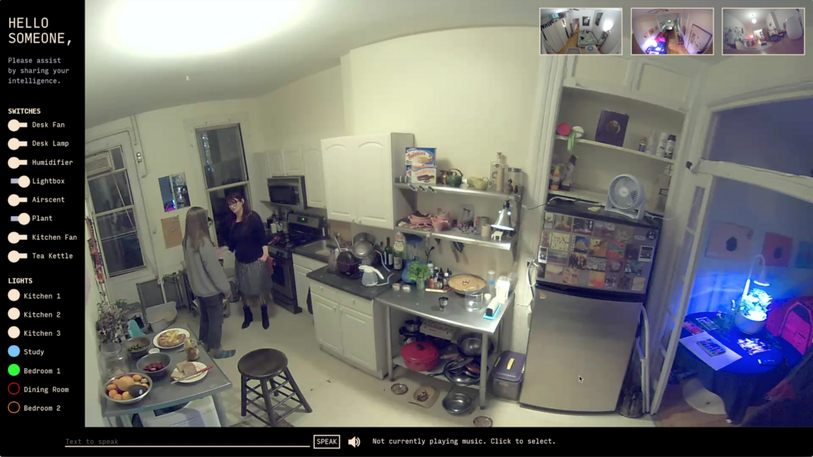 In the project SOMEONE [16], artist Lauren Lee McCarthy assumes the role of a digital platform. It integrates into the daily lives of other people and manages their home, their lighting, their calendar, even their sleeptime — as smart house algorithms do, but by hand. She’s looking through the cameras, talking to the microphones and sending out the notifications.
