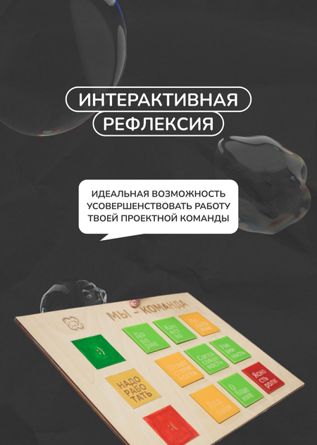 The project is a wooden field with nine card slots, the team performance criteria. For example, quality, coherence, trust, clarity of role, timeline. The point is, it’s possible to evaluate the criteria with a color system. Okay, the green card means that everything was done great, yellow-- that you have to work, and the red card is very bad. The team is thus engaged in a massive discussion and an overall picture of the work done. The project was developed for almost a year and went through all stages of design thinking, ranging from empathy and user analysis to the generation of ideas and testing.
