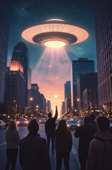 промпт генерации фонов: ufo poster, grainy, cinematic, realism, modern city, usa aestchetic, mystical ufo, ufo sighting, cinematic photography, grain, people looking at a ufo, big ufo in the sky, many ufos in the sky, low contrast, background picture Leonardo Phoenix 1.0 Cinematic