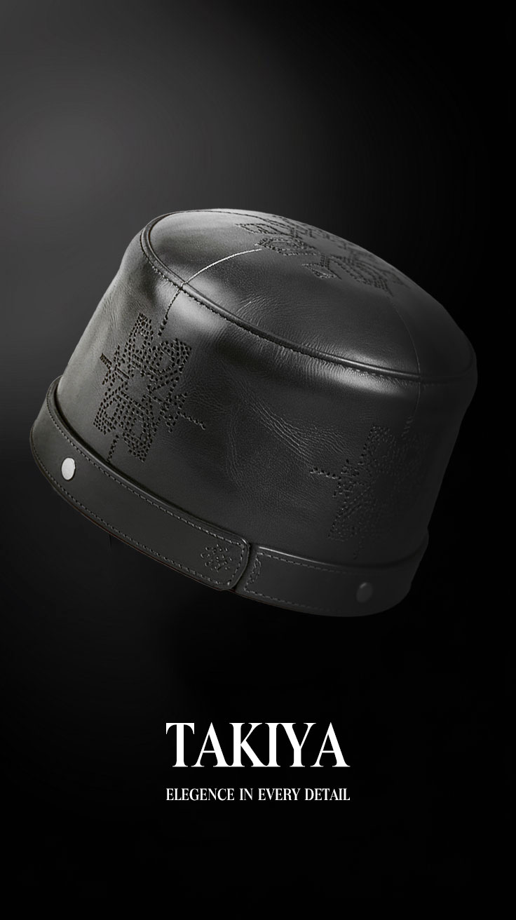 Prompt: Create a sleek, minimalist poster emphasizing the luxurious craftsmanship of the TAKIYA leather tubeteik. The poster should showcase the tubeteik from a side angle, highlighting its clean, structured form and delicate Kazakh ornamental patterns embossed into the leather. The design should be centered on a simple black background with a soft gradient, allowing the tubeteik’s texture and intricate details to stand out. The color palette should be black, white, and beige, with metallic silver accents subtly incorporated into the design, reflecting the silver detailing often found in Kazakh ornaments. The tagline «Elegance in Every Detail» should appear in a modern grotesque font, with smooth, flowing lines that evoke a sense of sophistication and timelessness.