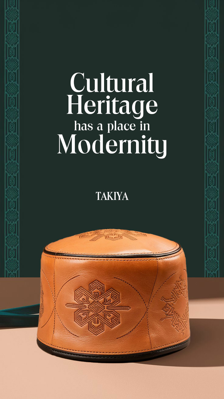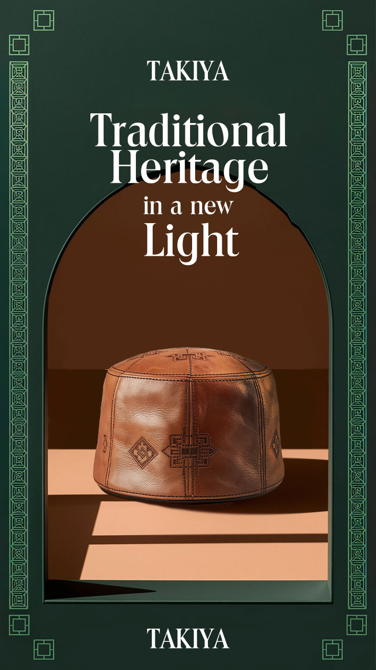 Prompt: Create an eye-catching, minimalist billboard for the brand TAKIYA, showcasing its luxurious leather tubeteiks. The billboard should feature a large, close-up image of a leather tubeteik as the central focal point. The tubeteik should have intricate Kazakh ornamental patterns embossed on the leather, subtly glowing against a neutral, dark background that contrasts with the earthy tones of the tubeteik itself. The color palette should include shades of black, beige, and forest green, with metallic silver accents to evoke the elegance of Kazakh silver ornaments. The tagline «Tradition. Reimagined.» should be prominently displayed in modern, clean typography, with a simple yet elegant grotesque font, possibly with subtle antique-inspired elements to link to the brand’s heritage. The design should be clean and uncluttered, ensuring that the product stands out. The overall look should be bold yet refined, conveying a sense of sophistication and cultural pride. The billboard should be large-scale and impactful, easily visible from a distance, and reflect TAKIYA’s fusion of traditional Kazakh design with a contemporary, luxury aesthetic.