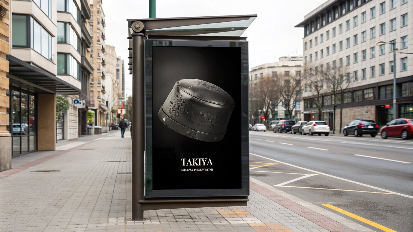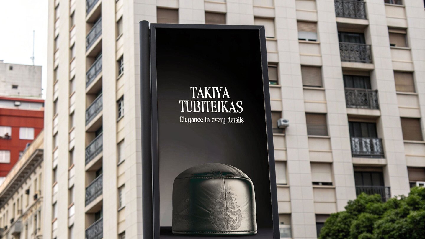 Prompt: Create a realistic mockup of a billboard featuring the TAKIYA brand, displayed prominently in an urban cityscape. The billboard should showcase the modern, minimalist design of the TAKIYA logo, along with the tagline «Tradition. Reimagined.» The background should be dark, allowing the leather tubeteik with Kazakh ornamental patterns to stand out as the central focus. The color palette should include neutral tones like black, beige, and forest green, with metallic silver accents for an elegant touch. Place the billboard in a busy, urban setting with tall buildings, streets, and pedestrians, reflecting a vibrant city environment. The design should look impactful and professional, easily visible from a distance, while blending seamlessly with the modern city landscape. The lighting should be natural, capturing the billboard’s presence both during the day and at night, ensuring that the design remains striking and recognizable.