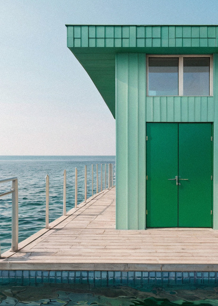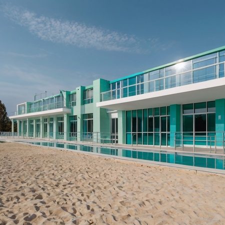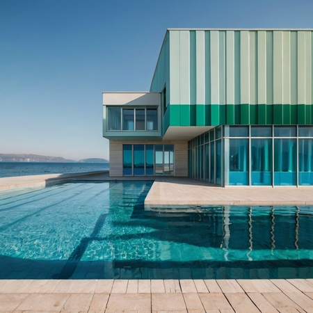 /imagine prompt: modern and youthful exterior of POPLAVOK Swimming School by the Sea. On the facade there is a large inscription POPLAVOK. Calm soft shades, a little sea theme, all in colors in a gradient from blue to green and emerald. The basis of the style is minimalism.