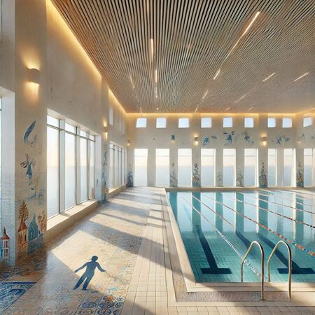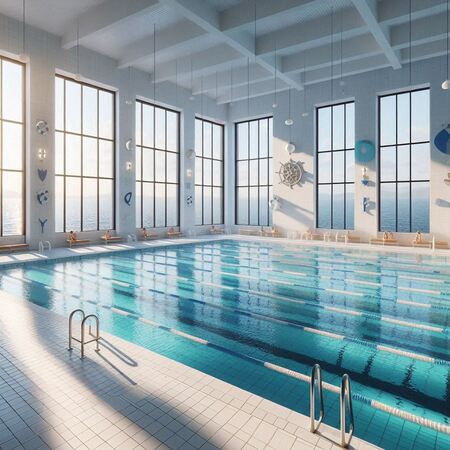 /imagine prompt: the interior of the swimming school next to the sea «POPLAVOK». The windows are rectangular. Light help, sunny and diffused light. The basis of style — simple shapes and white tiles with bright color accents. The interior has a nautical theme. There are several paths for swimming.