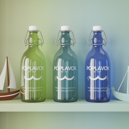 /imagine prompt: create 3D models of inflatable lap mockups for the brand of swimming school by the sea «POPLAVOK». Based on minimalism and simple graphics with a gradient from green to blue color. There is a little bit of nautical theme. The bottles stand on a shelf in the building of the swimming school.