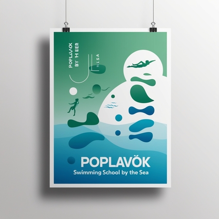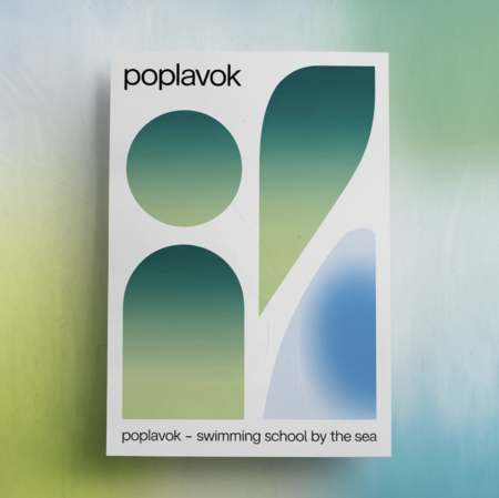 /imagine prompt: trendy advertising poster in minimalistic style for the swimming school by the sea POPLAVOK. On the poster there are abstract shapes, the style is based on minimalism and gradient from green to blue color. The background is light. The poster is printed on high quality paper with the inscription «POPLAVOK — swimming school by the sea».