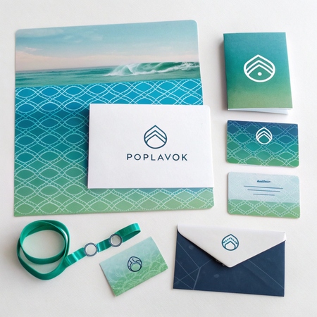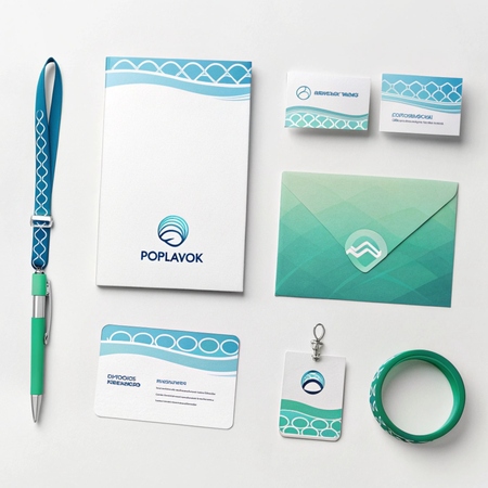 /imagine prompt: create a layout of printed products (ID cards, paper bracelets, envelopes, business cards) on a white background for the swimming school by the sea «POPLAVOK». The basis of the style is gardient from green to blue color.