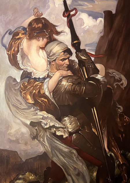 Второй этап — «гризайлевый» или «подмалевок». Начиная с самого светлого, в картине закладывается объем цинковыми белилами и вандиком. Светлые части неба и принцессы были самыми сложными для написания, учитывая структуру цинковых белил, для плотности в конце этапа были добавлены титановые белила, позволившие добиться нужной белизны. Дракон был написан последним с использованием лака и пинена, однако даже на этот этап был взят не слишком густо, чтобы оставить возможность доработать детали уже сверху после завершения лессировок. Фактура добавлялась кистями, мастихинами, нанесением краски на пищевую пленку. Когда основная работа над подмалевком была закончена, некоторые части пришлось дополнительно осветлять тонкими слоями, например кожу персонажей и небо.