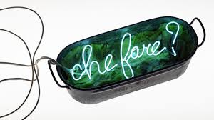 Так например, в следующих работах уличный художник подобно Марио Мерцу пытаясь отрефлексировать происходящее, помещает неоновую ленту в форме определенной надписи в пространство, ограниченное рамками.