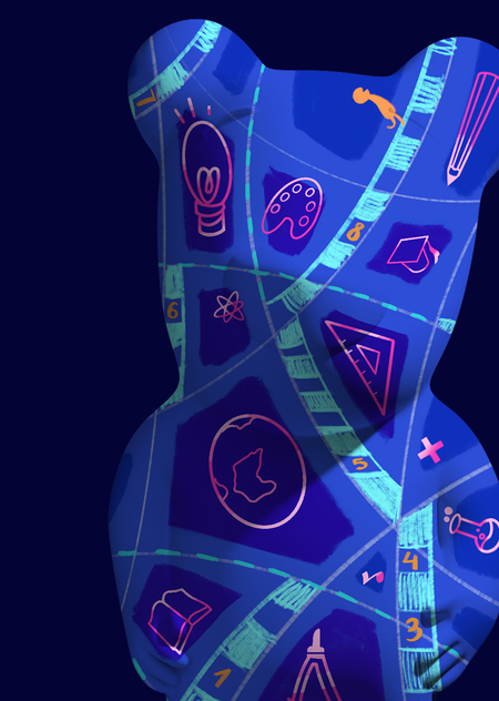 Таким образом, я пришла к выводу, как должен выглядеть паттерн для Спотти. Обучение — путь, порой тернистый, но оттого не менее интересный и замечательный. Поэтому идея, выразить «дорогу» к вершинам через классическое изображение поля для настольной игры, мне показалась наиболее подходящей. Не менее важной является и графическая подача работы — нарочито текстурные, как бы недоведенные штрихи, создающие эффект мелового рисунка. А мел ассоциативно подводит зрителя к мыслям о детстве, школьной скамье, университетской аудитории. Определенным образом это не менее важная атрибутика образовательного процесса. Оранжевая фигурка символизирует обучающегося. Он, как фишка на игровом поле, постепенно продвигается по «образовательной» лестнице к поставленной цели. Знакомая всем учебная символика — глобус, колба, угольник, циркуль, нота, палитра и подобное, расположенные на паттерне, указывают на различные области обучения. Их наличием я подчеркнула тематику паттерна Спотти.