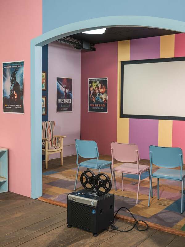 «A photo of a movie set. There’s a movie projector and a screen. There are chairs in front of the screen. The walls have movie posters. There’s a doorway to the left. The room has a wooden floor. Pastel pink, purple, blue, beige colours»