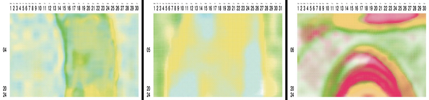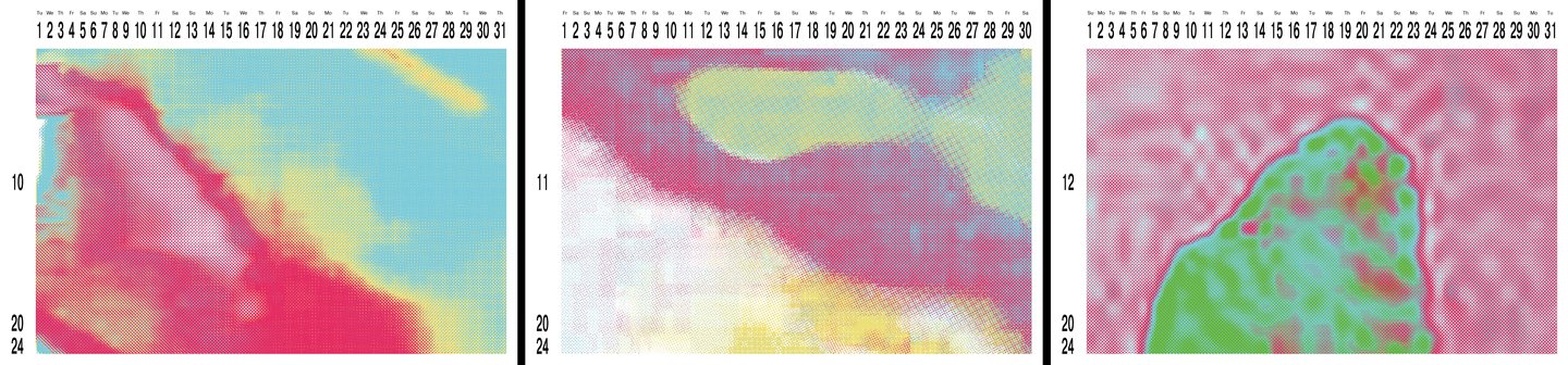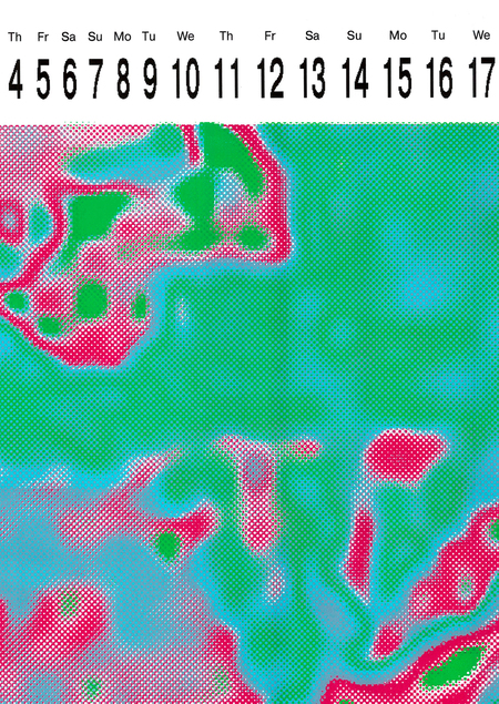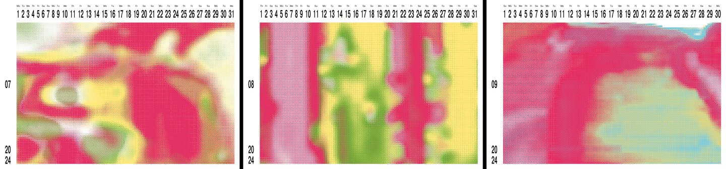 Календарь собран из 12 листов с изображениями из личного архива, которые попадают в него в том же порядке, в каком были зафиксированы. Я решила печатать календарь шелкографией в 3 цвета. Каждое изображение разложено на 3 слоя. Всего я использовала 5 цветов: черный для типографики и синий, зеленый, желтый, красный — в соответствии с сезонами года. Слои собирались по такому принципу: цвет текущего сезона — 2 слой, цвет предшествующего ему — 1 слой, цвет следующего за ним сезону — верхний слой. Листы формата А2.