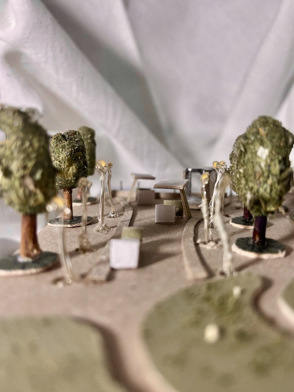 “ Макет сделан на основе переплетного картона толщиной 2 миллиметра. В качестве начала макетирования, был заложен условный рельеф местности. Для озеленения было выбрано 2 вида деревьев: для официальной парковой и дополнительной прогулочной зоны. Следующим этапом стало наполнение парковой зоны дополнительными элементами: освещением, деталями, предполагаемыми в обычной жизни и зелеными насаждениями. Окончательным этапом стало установление всего проекта на платформу.