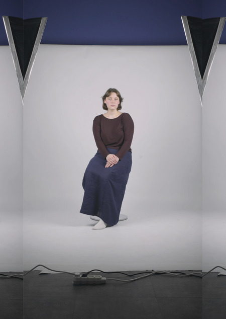 Перед проекцией стоят два софтбокса с тусклым светом. Запись закольцована. На место медиума, фотоаппарата, невидимого фотографа, в экспозиции становится зритель.