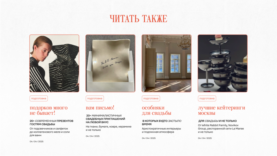 Платформа для создания фирменного стиля свадьбы, ориентированная на зумеров. Сервис предлагает кастомизацию приглашений в формате лэндингов и возможность продвижения людей из свадебной индустрии через интерактивное медиа на сайте сервиса.
