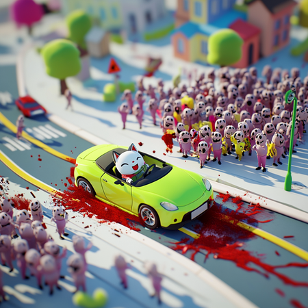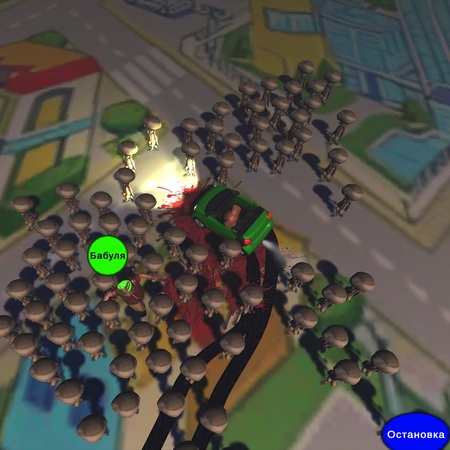 A chaotic cartoon-style 3D scene set on a city map. A bright green convertible sports car with a cartoon character with animal-like ears (possibly fox or cat ears) leaves skid marks on the road, surrounded by a large crowd of small humanoid figures with rounded heads in a simplistic design. The car has collided with the crowd, and red stains on the ground represent a dramatic effect. The city map includes roads, colorful buildings, and a labeled bus stop (‘Остановка’). A specific figure, highlighted with a green marker labeled ‘Бабуля, ’ stands out in the center. The scene is dynamic and rendered in a stylized, colorful 3D animation style, conveying a humorous yet dramatic tone.