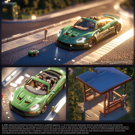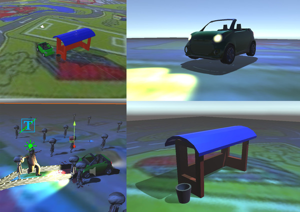«A 3D scene featuring four distinct segments: 1. A cartoonish, simplified green convertible sports car next to a small blue-roofed bus stop with red wooden beams. The background shows a stylized, map-like terrain with roads and greenery, rendered in a PS2-style aesthetic. 2. A close-up of the green convertible with glowing headlights, showing a slightly smooth and retro 3D model. The background is a blurry sky and ground. 3. A chaotic scene with alien-like humanoid creatures surrounding the car. The focus is on a character emitting light beams from their body, creating a dramatic effect, with streaks and shadows rendered in retro gaming style. 4. A standalone blue-roofed bus stop with a simple, minimalistic design, placed on the map-like ground. Rendered in low-polygon, PS2-era 3D style with colorful but slightly muted textures and cartoonish lighting.»