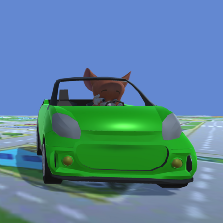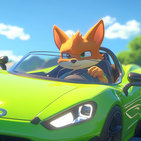 A cartoon character with animal-like ears (possibly fox or cat ears) driving a bright green convertible sports car. The character is visible only partially, focusing on their head and upper body as they hold the steering wheel. The car has a simplified and smooth design with prominent headlights and a rounded body shape. The background features a clear blue sky and a map-like virtual road surface below. Rendered in a colorful, slightly stylized 3D animation style.