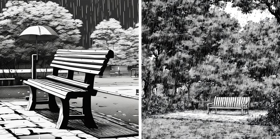 1. A bench in the park during the rainy season in the style of Hokazono Takeru’s black and white manga 2. <…> in the style of Inyo Asano’s <…> 3. A bench in the park during the rainy season <…>