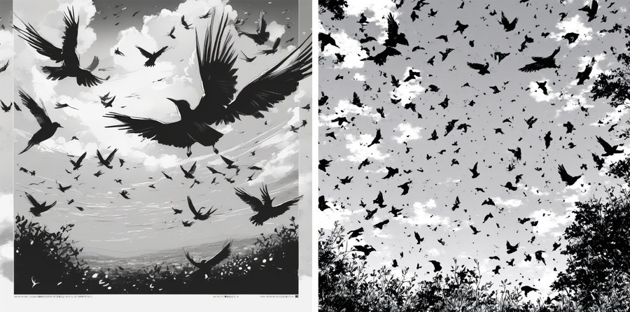И напоследок, животные стали хитом этого процесса обучения, получаясь довольно правдоподобно и соответственно стилю манги. Хорошо подходит для разнообразия фонов. Также такой эксперимент даёт понять, что Kagurabachi_style хорошо справляется не только с созданием людей на заднем плане, но и животных и птиц.