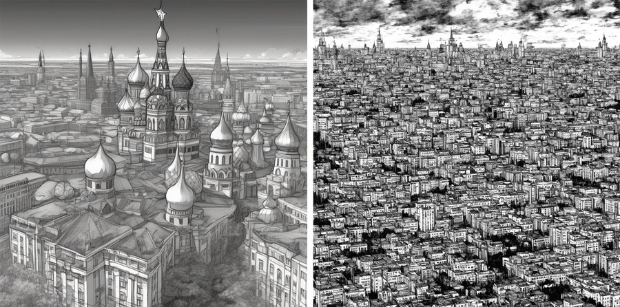 Kagurabachi_style отлично имитирует стиль Такеру Хоказоно в городских пейзажах сверху. Здесь детализация придаёт городу особенный шарм. Она также прекрасно справляется с построением архитектурных сооружений, что замечательно подходит для замены рисованного заднего и переднего планов в городе. Даже несмотря на японский стиль окружения в датасете, у нейросети получается воссоздать и другие его стили, например уходящие ближе к церковной православной тематике.
