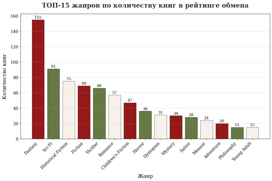 Наиболее популярные жанры: Фэнтези, Научная фантастика, Мистика/Триллеры. Читатели чаще обмениваются книгами развлекательного жанра и меньше всего книгами про философию.