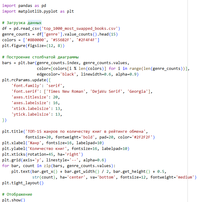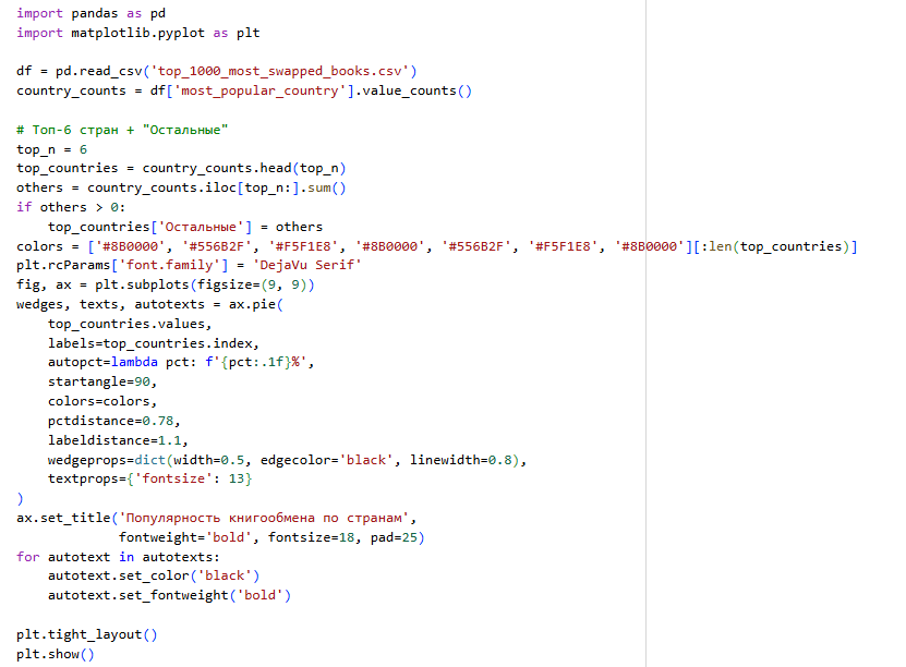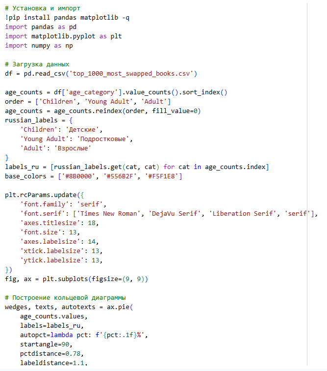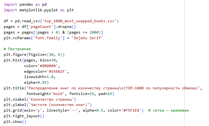Типы диаграмм решают конкретные задачи: столбчатые сравнивают абсолютные значения, круговые процент от целого, точечные визуализируют распределение, гистограмма показывает частотность значений в диапазоне (страниц книги, например). Задача: проанализировать, какие книги наиболее популярны и изучить внешние факторы, которые влияют на книгообмен.