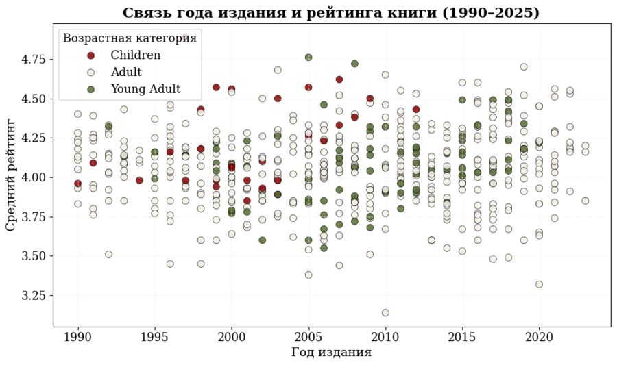 Вывод: Год немного влияет на рейтинг, но практически не является определяющим фактором