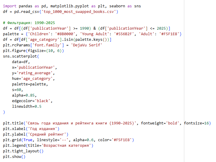 Датасет для анализа и визуализации я искала на kaggle.com. Так как на 2 курсе дизайна много времени мы уделяем созданию книг и их анализу, я выбрала статистику о 1000 самых популярных книг для обмена.