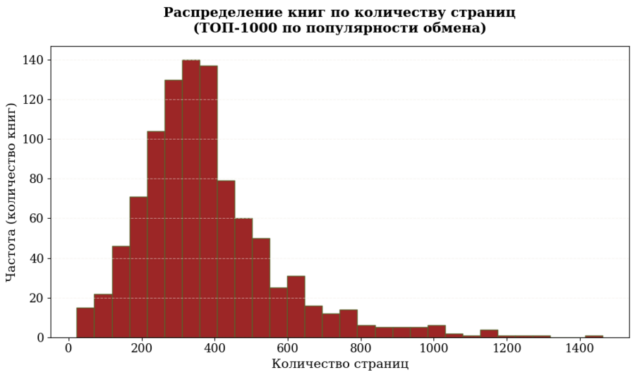 Самые популярные книги для обмена, как правило, среднего объёма: от 200 до 400 страниц. Предположительно, это обусловлено небольшим весом переплёта, что позволяет легко перемещать книги и носить с собой в сумке.