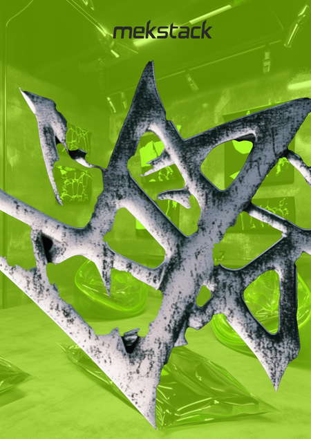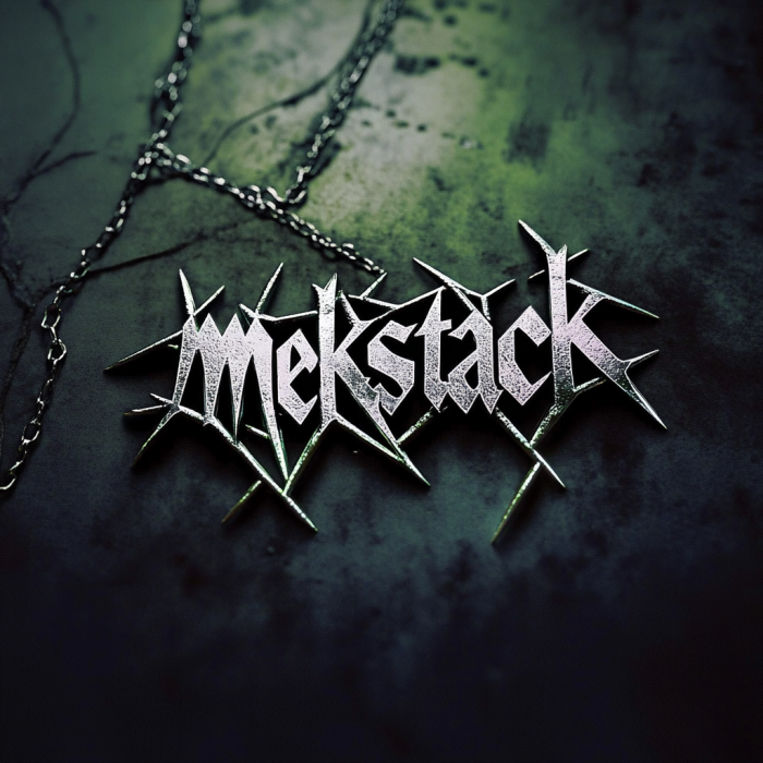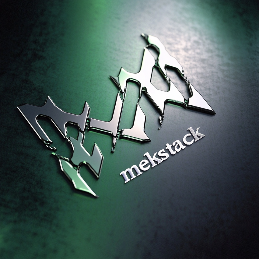 /imagine prompt minimalistic 3d logo with metal texture of the clothing barnd called «mekstack». Rough gothic font style. Metal and green colors --v 6.1